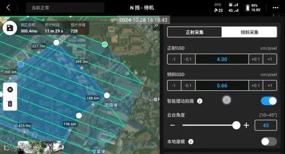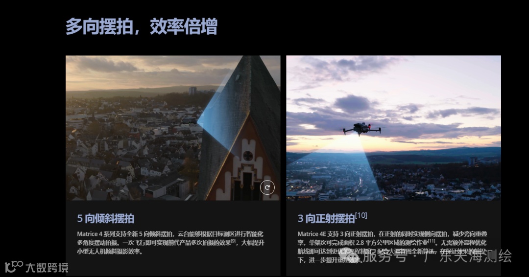 1.二维采集新增三向摆拍。通过左右扫摆的方式增加旁向重叠率,从而减少航线数量,增加采集效率。