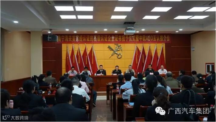 今天上午,“南宁海关首家经认证的高级认证企业证书授予仪式暨AEO中欧互认推介会”在柳州海关举行,广西汽车集团所属企业柳州广菱汽车技术有限公司(以下简称“广菱技术”)获得高级认证企业证书,成为广西第一家经认证通过的海关最高信用等级企业, 将享受AEO互认国家或者地区海关提供的通关便利措施。