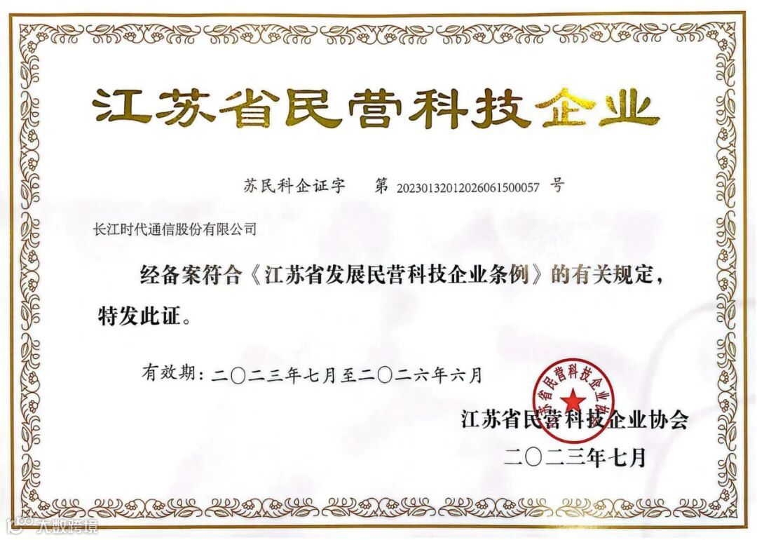 近期,江苏省民营科技企业协会公布了2023年江苏省民营科技企业备案名单。长江时代通信股份有限公司凭借领先的科技创新能力入选,被认定为“江苏省民营科技企业”(苏民科企证字 第20230132012026061500057号)。