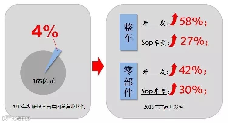 公司不断加大科研投入,2015年研发经费占集团当年总营业收入的4%。另一方面,2015年公司产品开发效率大幅提升,整车开发及实现SOP车型分别同比增加58%及27%;零部件开发及实现SOP车型分别同比增加42%及30%。