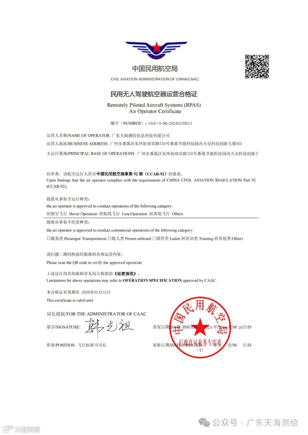 2024年1月26日,广东天海测绘信息科技有限公司荣获批民用无人驾驶航空器运营合格证