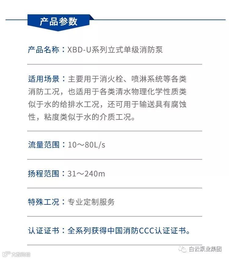XBD-U系列立式单级消防泵是根据消防系统用泵的特点,全面贯彻GB6245-2006《消防泵》标准设计的新一代消防泵,该系列产品经公安部消防装备质量监督检测中心检测合格,获消防CCC产品认可证书。
