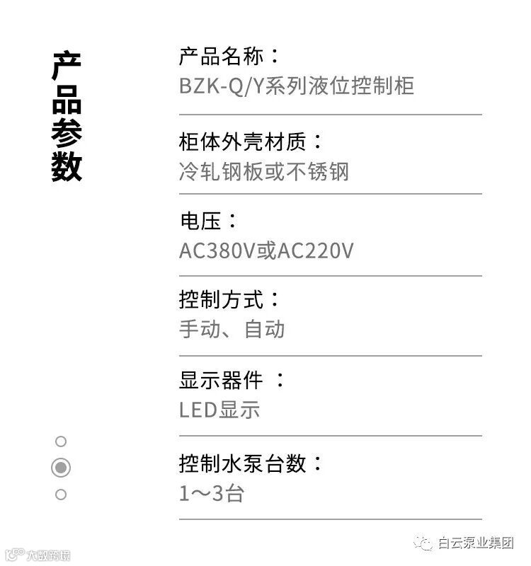 BZK-Y系列液位控制柜是应市场需求设计推出的一款智能高档,但又经济实惠,有着核心竞争力的全新产品,采用高质量的电子电路、高性能的电器元件,功能齐全、运行可靠。