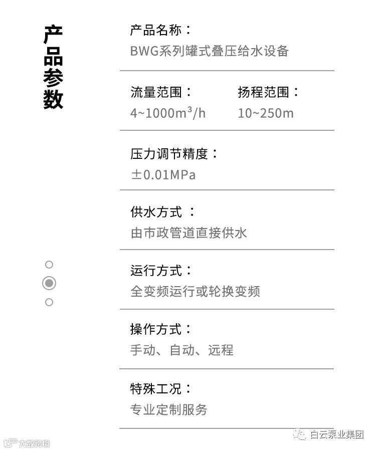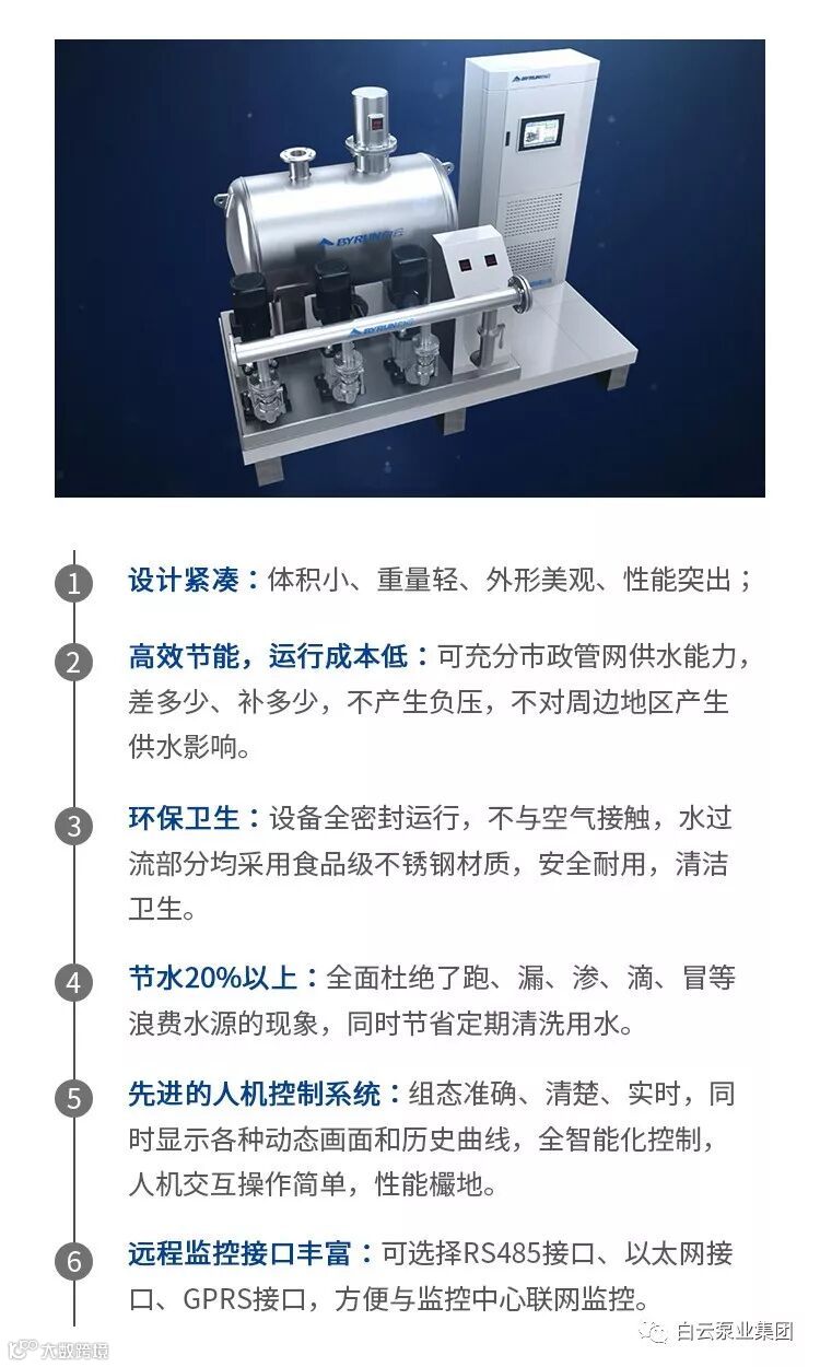 BWG系列罐式叠压给水设备是一种在原有管网水压力基础上再次加压的供水设备。它突破了以往只能对无压水进行加压的误区,并且通过对流体流态的控制保证了设备限量增压。不对管网产生压力影响。BWG系列罐式叠压给水设采用了系统工程技术,流体控制技术、微机变频技术、过秤组态技术、数据处理技术、远程通讯技术实现叠压(无负压)供水的全过程,通过可调控人机界面显示运行状态。以全新的设计原理、流程和结构,实现了真正意义上的管网叠压技术,节能、降耗、环保、卫生。