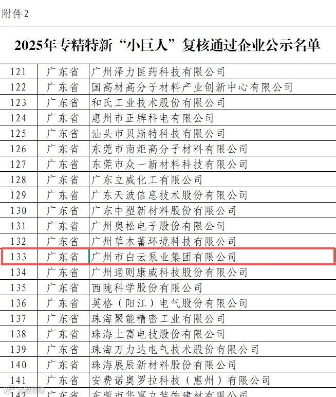 近日,国家工业和信息化部圆满完成了2025年专精特新“小巨人”企业认定和复核工作,并对通过企业名单进行了公示。广州市白云泵业集团有限公司凭借在技术创新、产品质量、市场应用及精细化管理等方面的综合实力,成功通过国家专精特新“小巨人”企业复核。