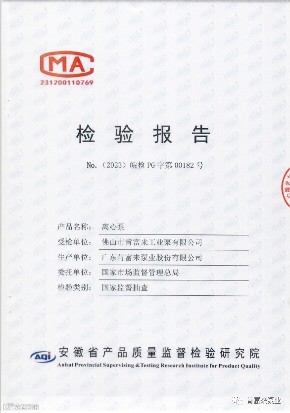 国家市场监督管理总局根据2023年度工作部署,委托安徽省产品质量监督检验研究院对佛山市肯富来工业泵有限公司依法进行产品质量国家监督抽查。根据2023年度泵类产品监督抽样范围和抽样条件,在相关人员协同下,抽查人员对工业泵库存离心泵GD65-19进行现场抽样及封样,封样产品寄往安徽省产品质量监督检验研究院进行抽查检验。近期,封样产品已完成抽查检验,并发放《产品质量国家监督抽查结果通知书》和《检验报告》。经过抽查检验,离心泵GD65-19检验结果合格。
