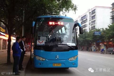 通勤车辆为全新空调大巴,正前方车窗贴有公司标志、前后窗上方配备LED显示屏清晰显示“五菱工业公司,柳东一号线”,绝对是高大上的路线!