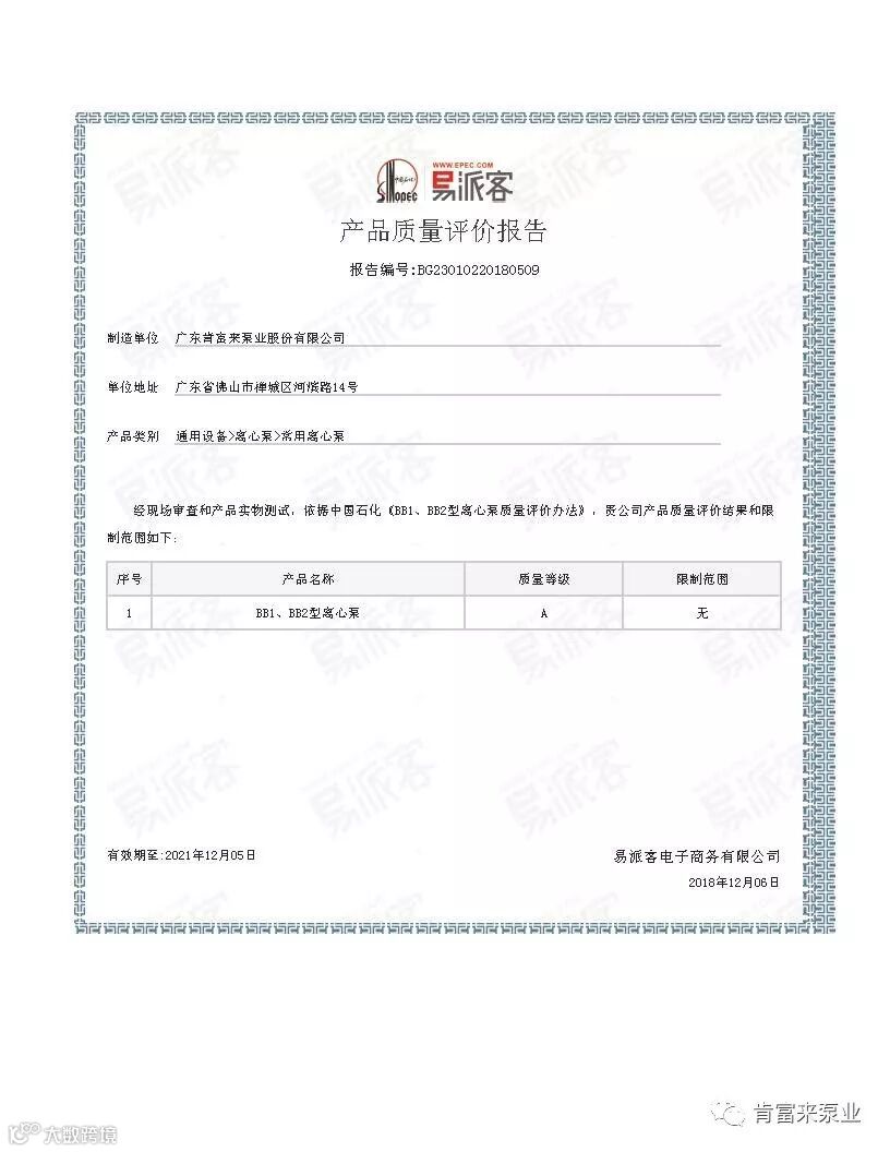 产品质量评价从资质等级、装备能力、质保体系、性能检测等方面,对产品给予专业评定。肯富来泵业BB1型离心泵凭借过硬的产品质量和优异的客户使用评价,同时经过中石化易派客相关专业技术人员和专家的现场严格审查和产品实物测试,荣获产品质量评价A级认证。