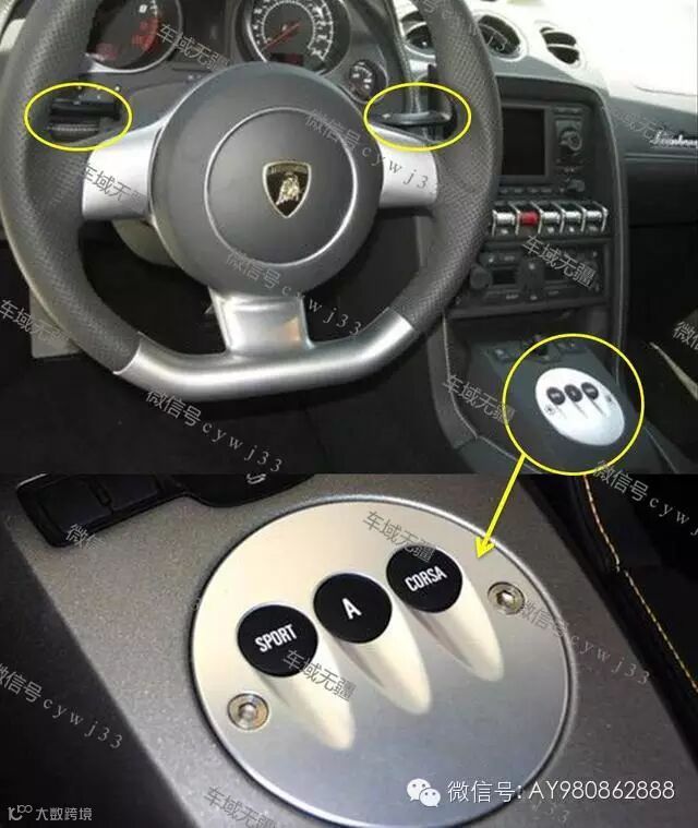 兰博基尼、法拉利等超跑,中控台退化到只剩几个按钮,驾驶员必须通过方向盘上的换挡拨片来切换档位。以兰博基尼LP560-4为例,启动发动机后,拨动方向盘右侧拨片,然后松开刹车,踩下油门,车才会开起来。停车时双手同时扣动方向盘两侧的拨片,则挂到N挡。要挂倒档,则必须按下驾驶员左膝盖上方的“R”键;中控台中的 “A”按钮用来切换自动换挡模式和手动换挡模式, “sport”为运动模式,“CORSA”为赛道模式,能够缩短换挡间隙和换挡时间。