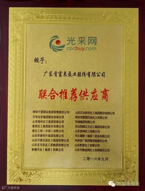 光采网副总裁张新介绍了相关评选流程,首先由18家采购企业推荐他们的供应商名单,在这些名单中,光采网又进行了严格筛选。获得表彰的企业必须有至少10家企业联合推荐才能入选,在汇总名单后,再发放给各采购商,如果名单中的供应商有过违约等问题,光采网还会将此供应商在名单中移除。经过了层层筛选,让产品质量更有保证,让采购企业用起来也更放心。广东肯富来泵业股份有限公司(原广东省佛山水泵厂有限公司)正是凭借过硬的产品质量、优质的服务、知名的品牌影响力,获得了中国石化联合会联合推荐供应商。