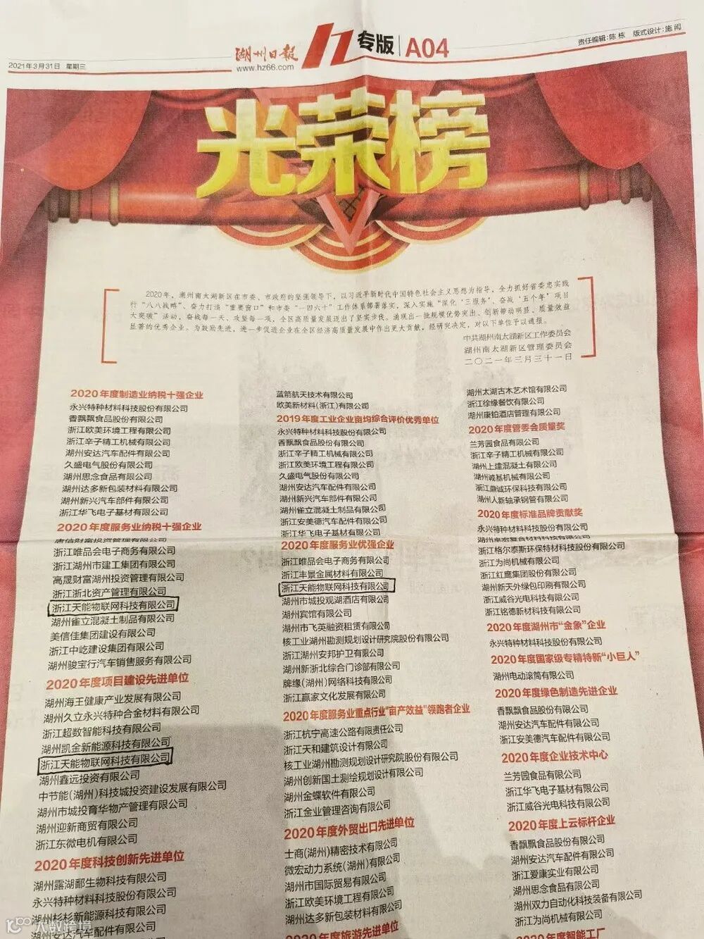 湖州天能太湖科技城企业——浙江天能物联网科技有限公司,荣获多项荣誉表彰。