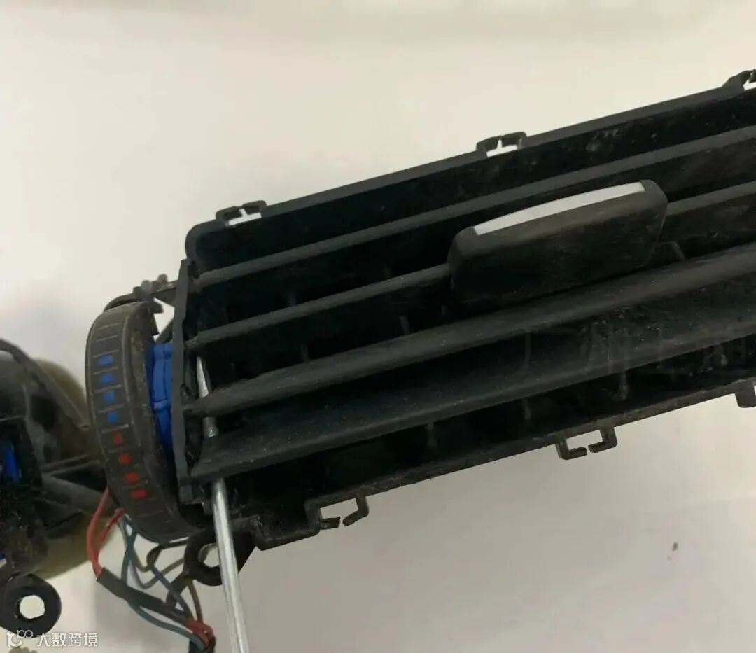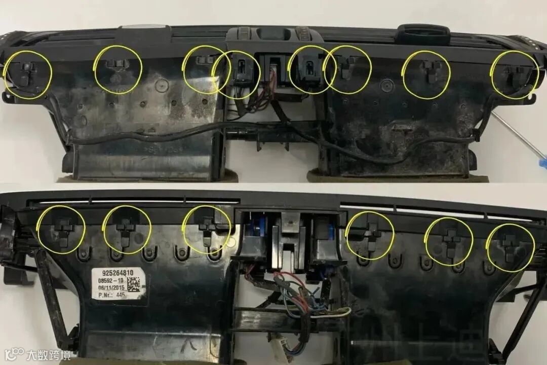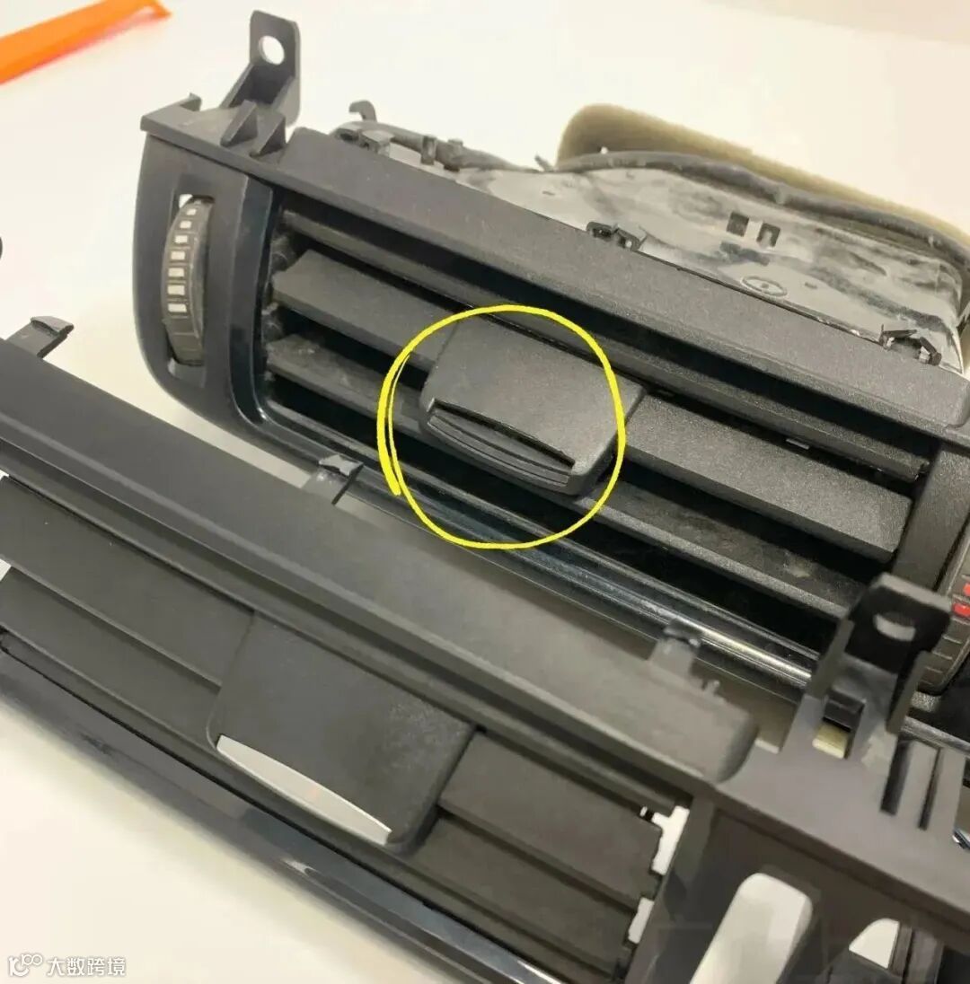 取出上迪全新面板,将拨片尾部三叉卡在原车后座大身里面最中间带镂空的叶片上,把两边脚位对准后座大身周边卡位用力按进去。