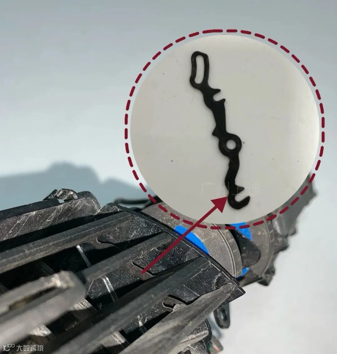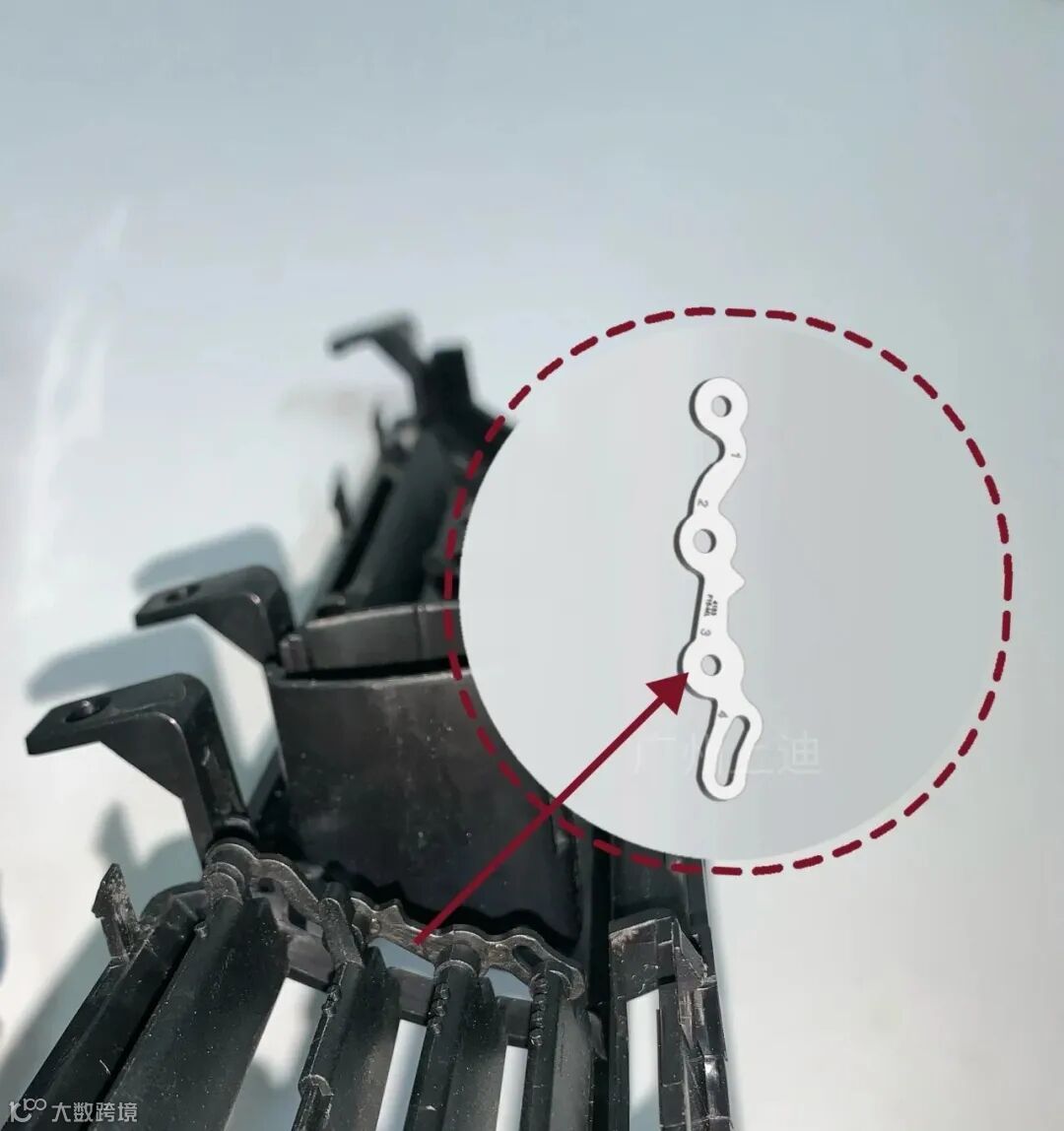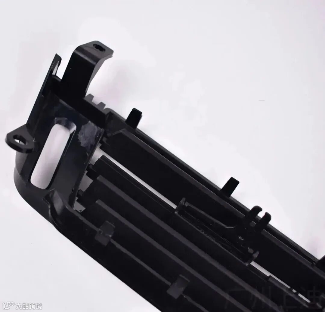 取出上迪全新面板,将拨片尾部三叉卡在原车后座大身里面最中间带镂空的叶片上,把两边脚位对准后座大身周边卡位用力按进去。