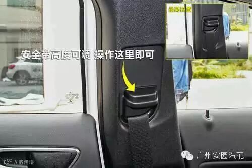其实,安全带也是可以调高低的,调节装置就在两侧B柱上,也有向外拔出解除锁止的,乘坐着可以根据自己的身高调节。