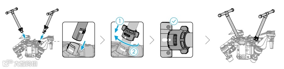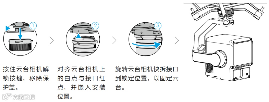 · 如无法安装云台,请检查飞行器接口是否被意外扭转,若由于意外扭转导致不平齐,请手动拨平后再装入云台。