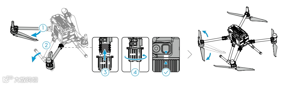 ②确保飞行器螺旋桨安装紧固、无破损变形,电机和螺旋桨干净无异物,螺旋桨和机臂完全展开,且机臂套筒、起落架均已锁紧。