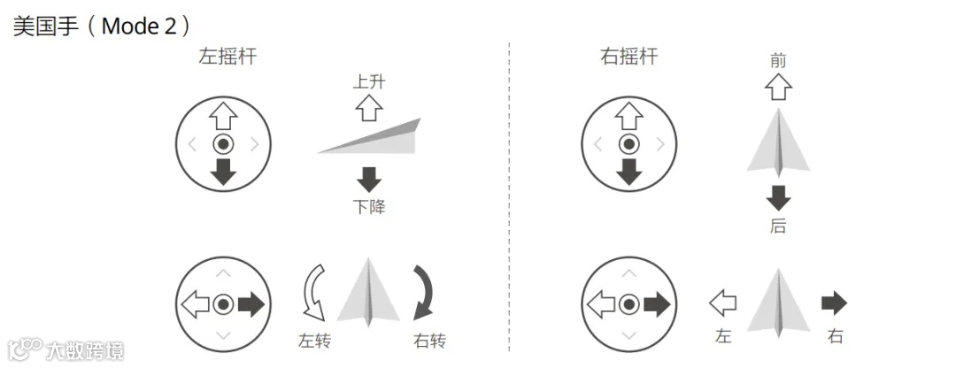 遥控器出厂时默认操控模式为美国手(Mode 2),本文以美国手(Mode 2) 为例说明遥控器的操控方式。