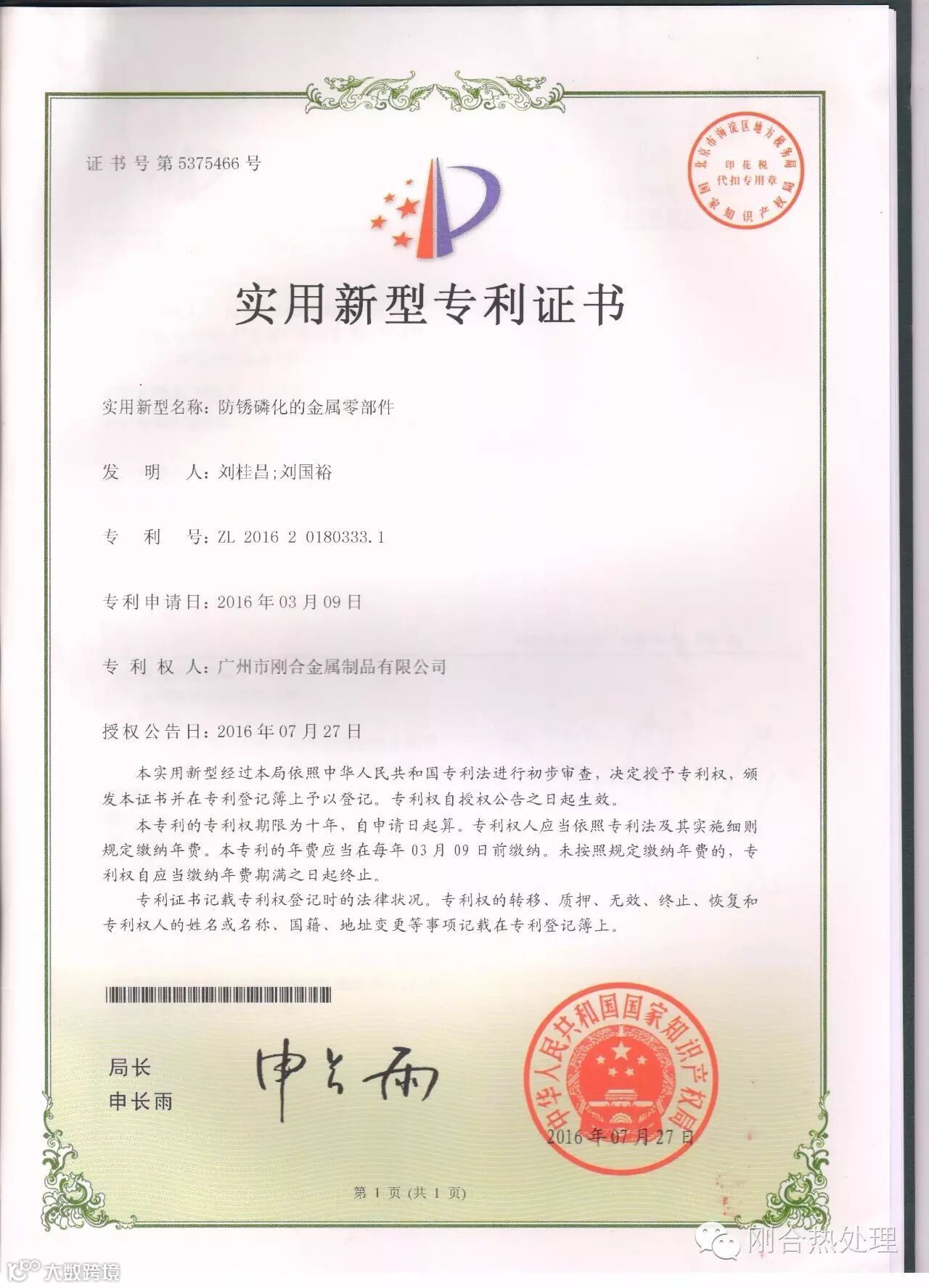 1、【实用新型专利名称】:防锈磷化的金属零部件