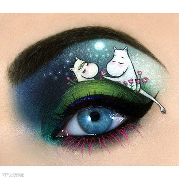 芬兰动画片中的主角姆明在国外有广大的粉丝,艺术家Tal Peleg竟然也能在眼皮上完美演绎这个充满童真的画作。