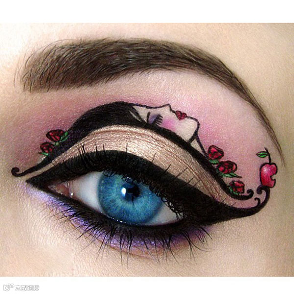 童话故事白雪公主因为误吃了坏皇后给的毒苹果而沉睡,Tal Peleg将睡美人画在了眼皮上。