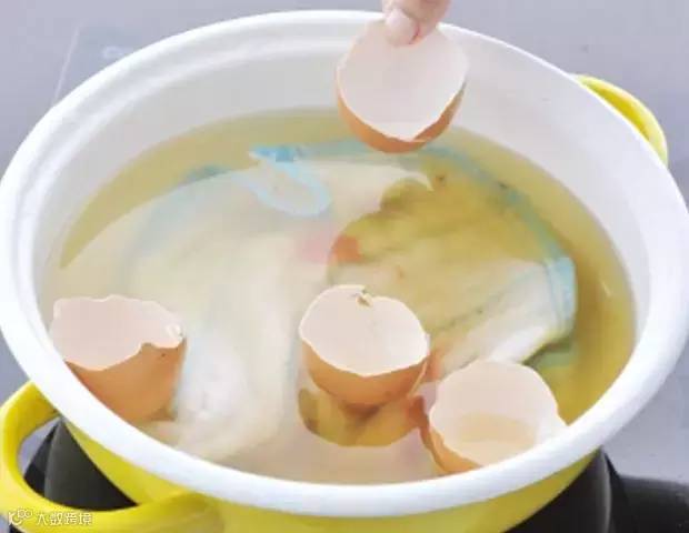 把抹布放在盛有清水的锅里,再放入生蛋壳,大火煮6分钟,然后取出晾干,污渍就会消失,平时做饭时蛋壳不要扔了,一举两得!