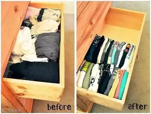 把衣服垂直码放在衣柜抽屉里,比水平放置更好找。