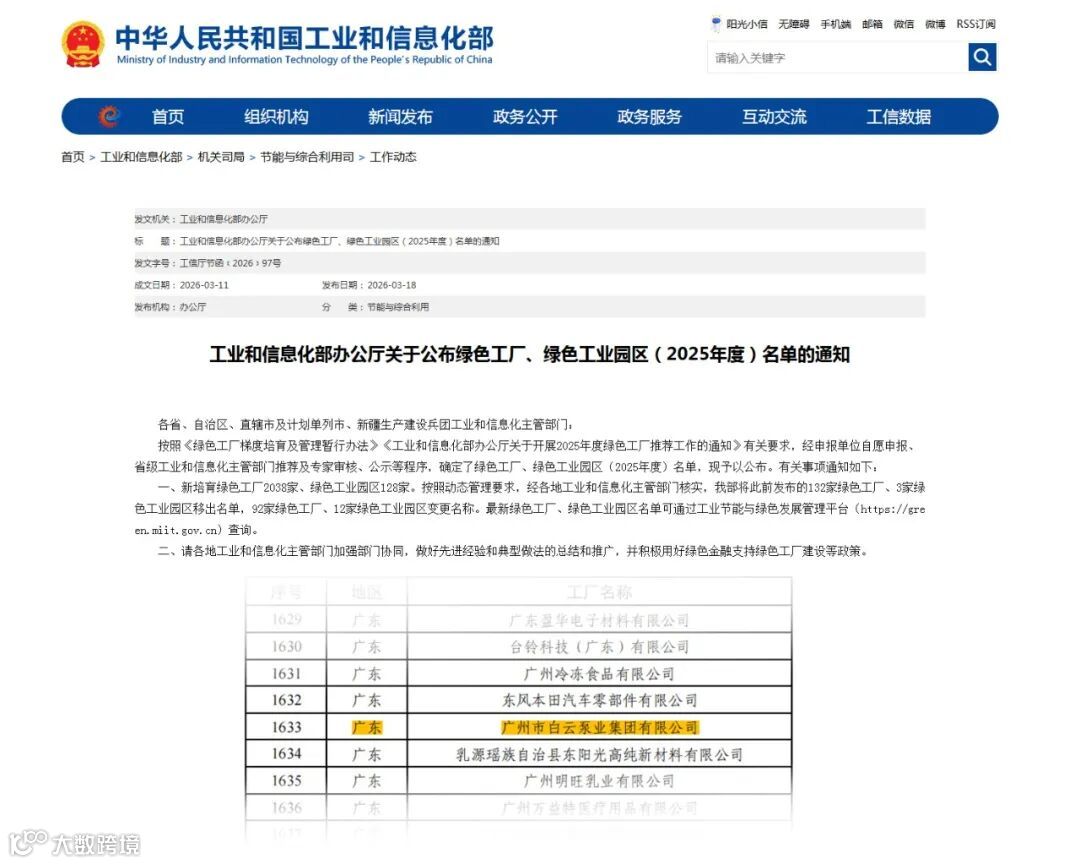 近日,国家工业和信息化部正式发布了《2025年度绿色工厂、绿色工业园区名单》,广州市白云泵业集团有限公司凭借在绿色发展、节能减排、循环经济等方面的卓越表现与突出贡献,成功荣膺国家级“绿色工厂” 称号!这是对公司长期以来坚持推动制造业高端化、智能化、绿色化转型实践的最高认可与肯定。
