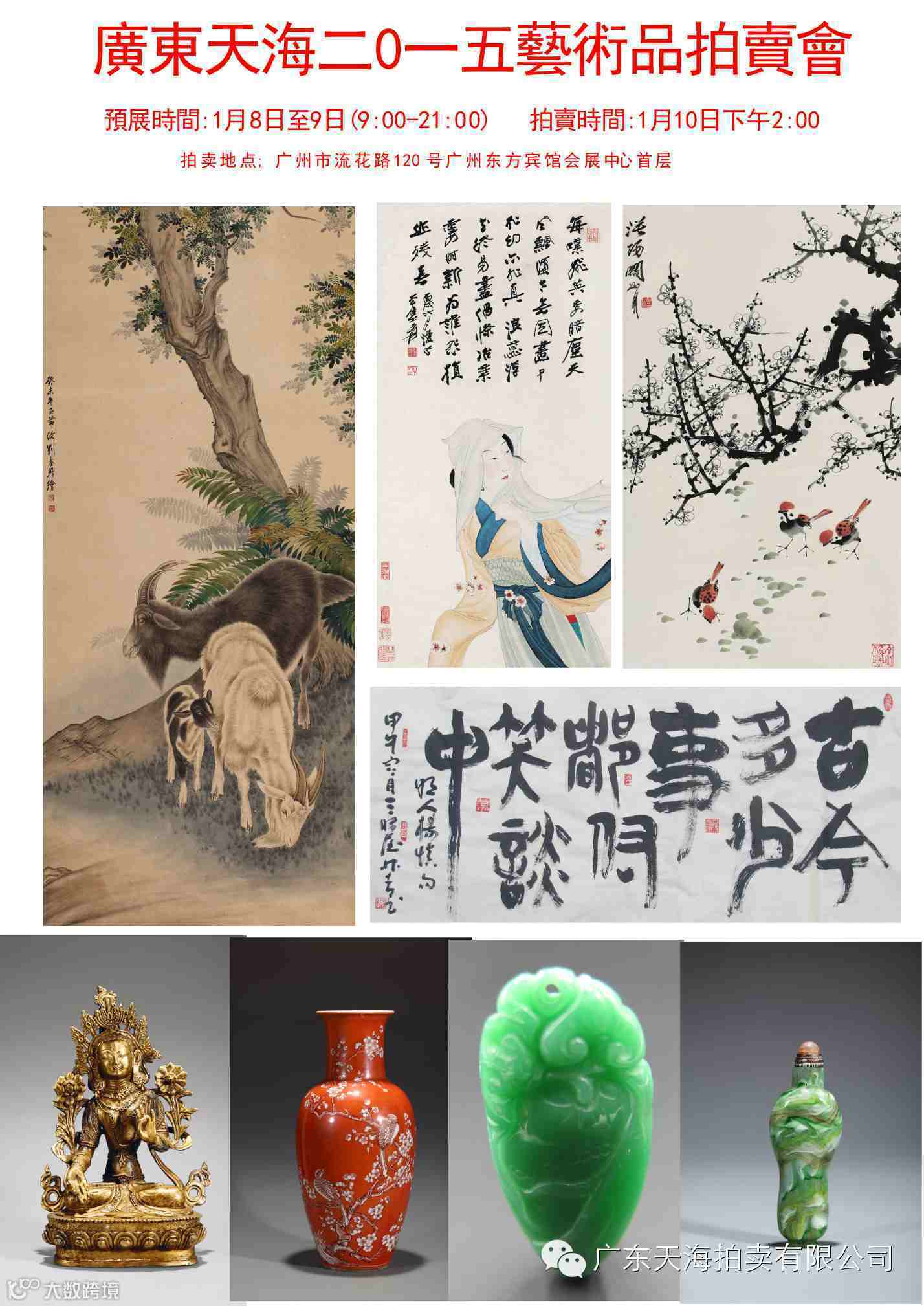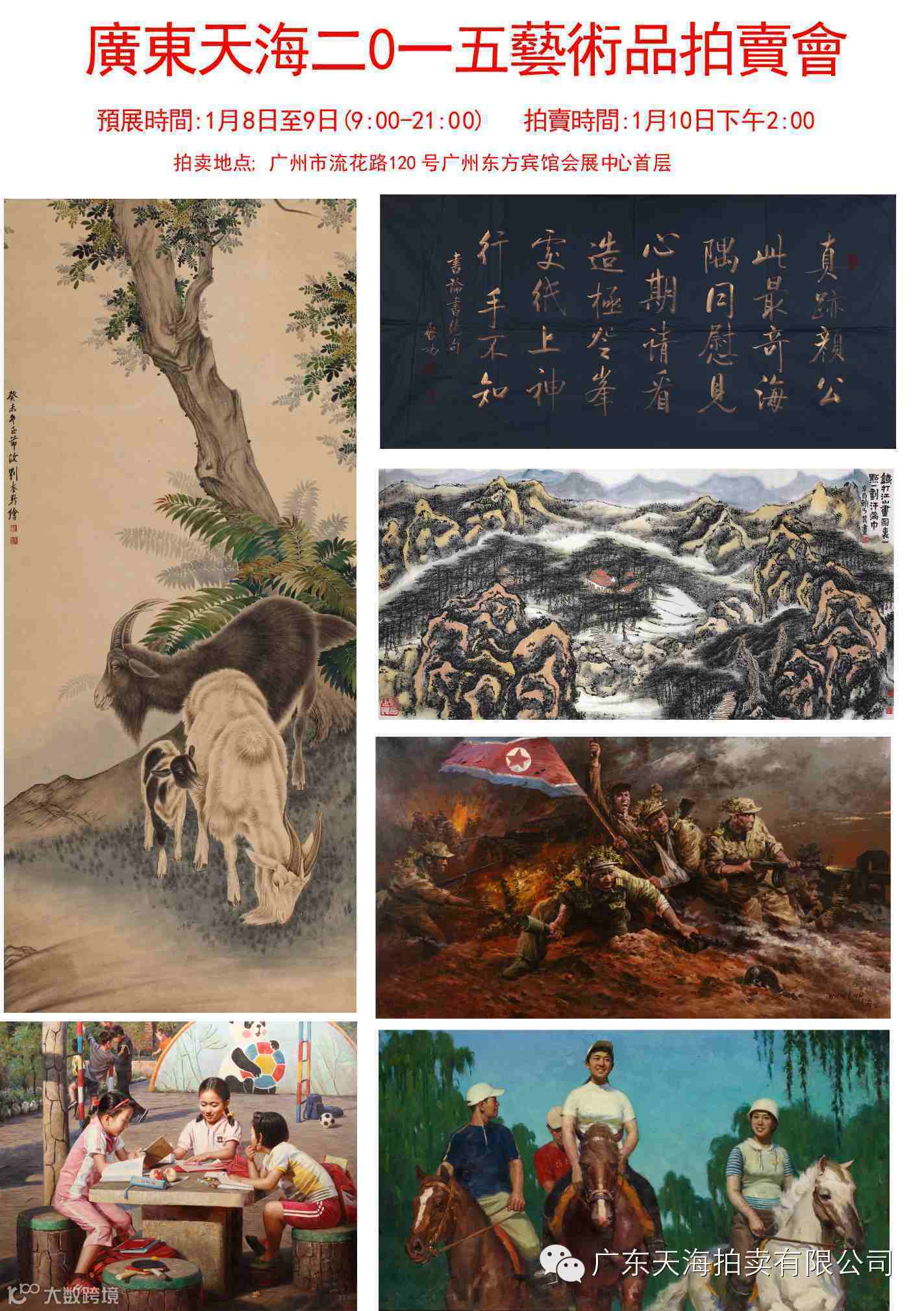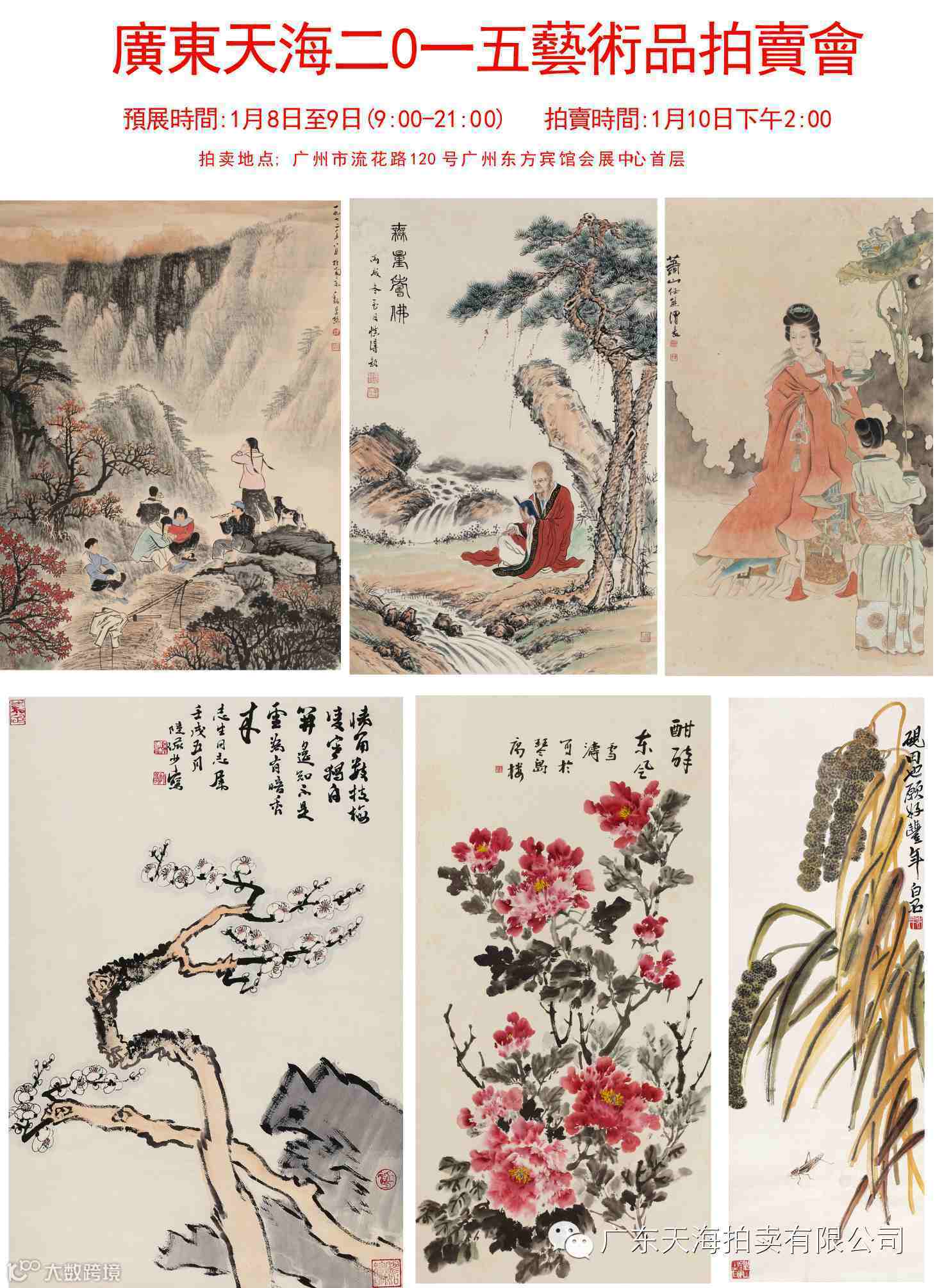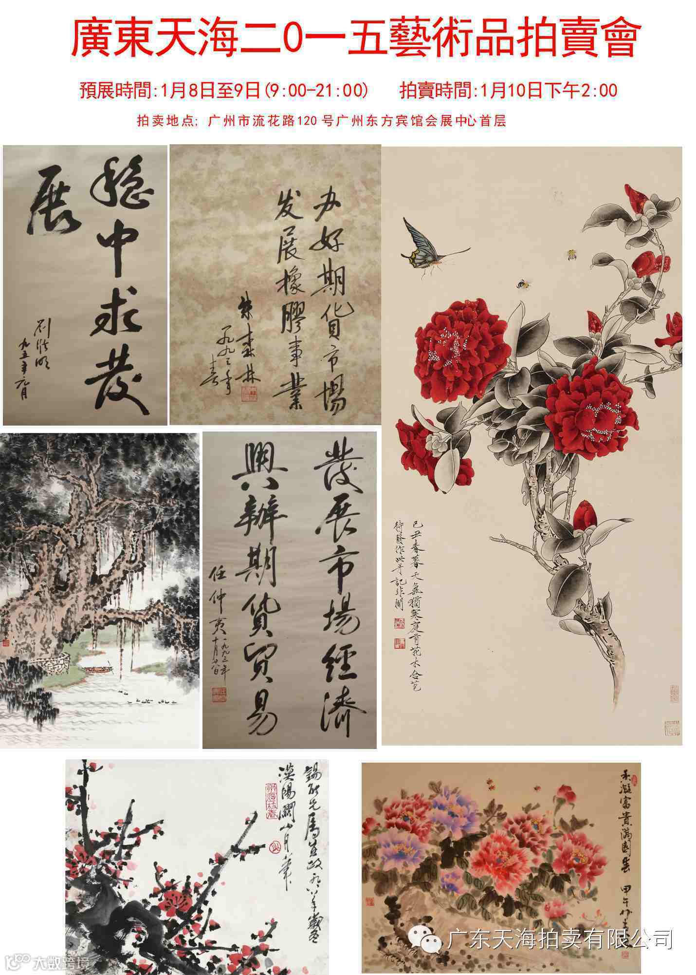 广东天海2015艺术品拍卖会 预展时间:2015年1月8日-1月9日 拍卖时间:2015年1月10日下午2:00 上午9:00-下午21:00(夜场预展) 拍卖地点:东方宾馆会展中心首层(广州市流花路120号) 联系电话:020-83823281