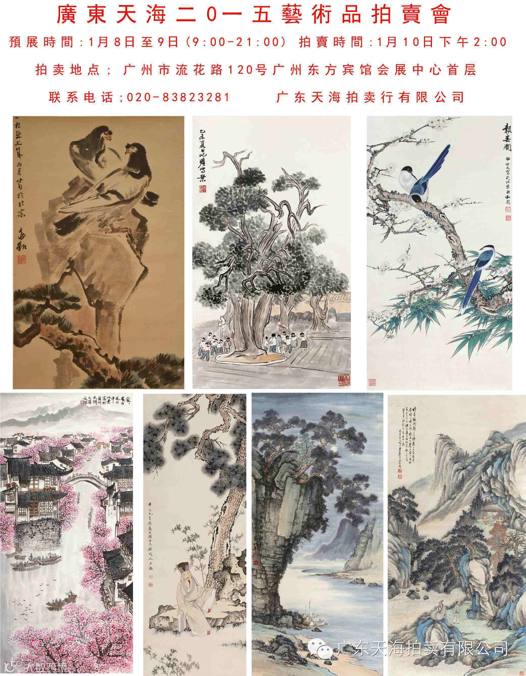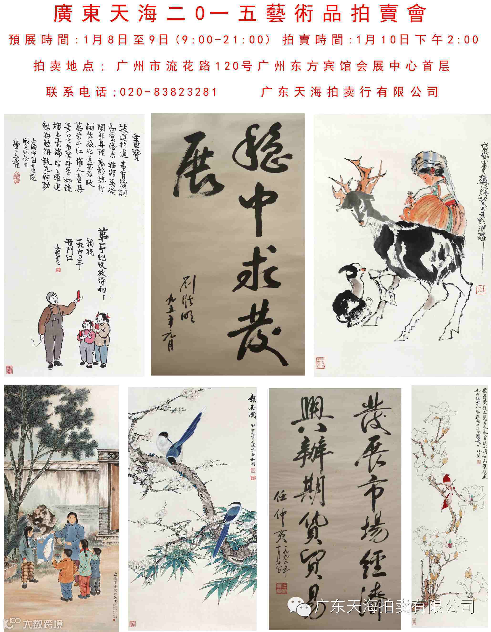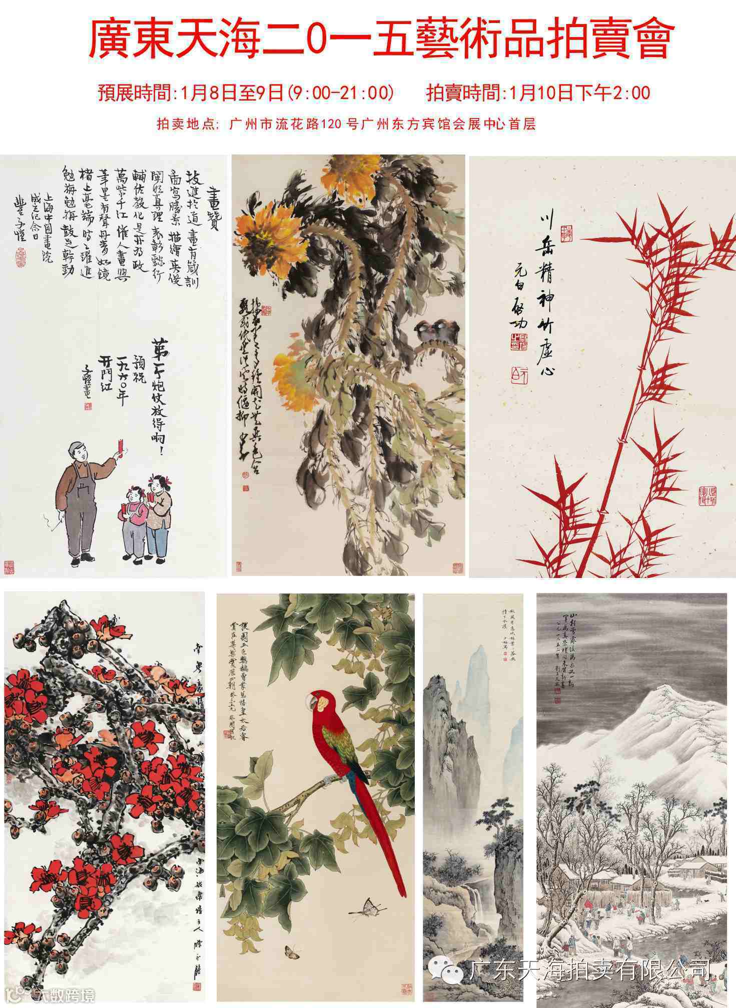 广东天海2015艺术品拍卖会 预展时间:2015年1月8日-1月9日 拍卖时间:2015年1月10日下午2:00 上午9:00-下午21:00(夜场预展) 拍卖地点:东方宾馆会展中心首层(广州市流花路120号) 联系电话:020-83823281