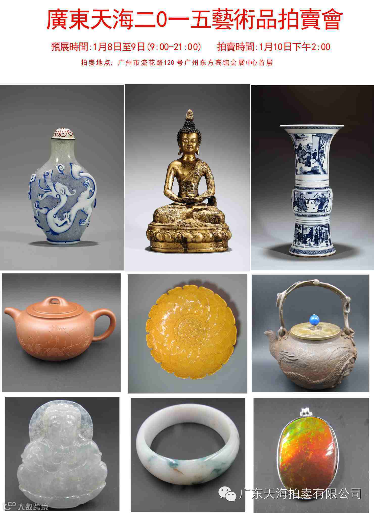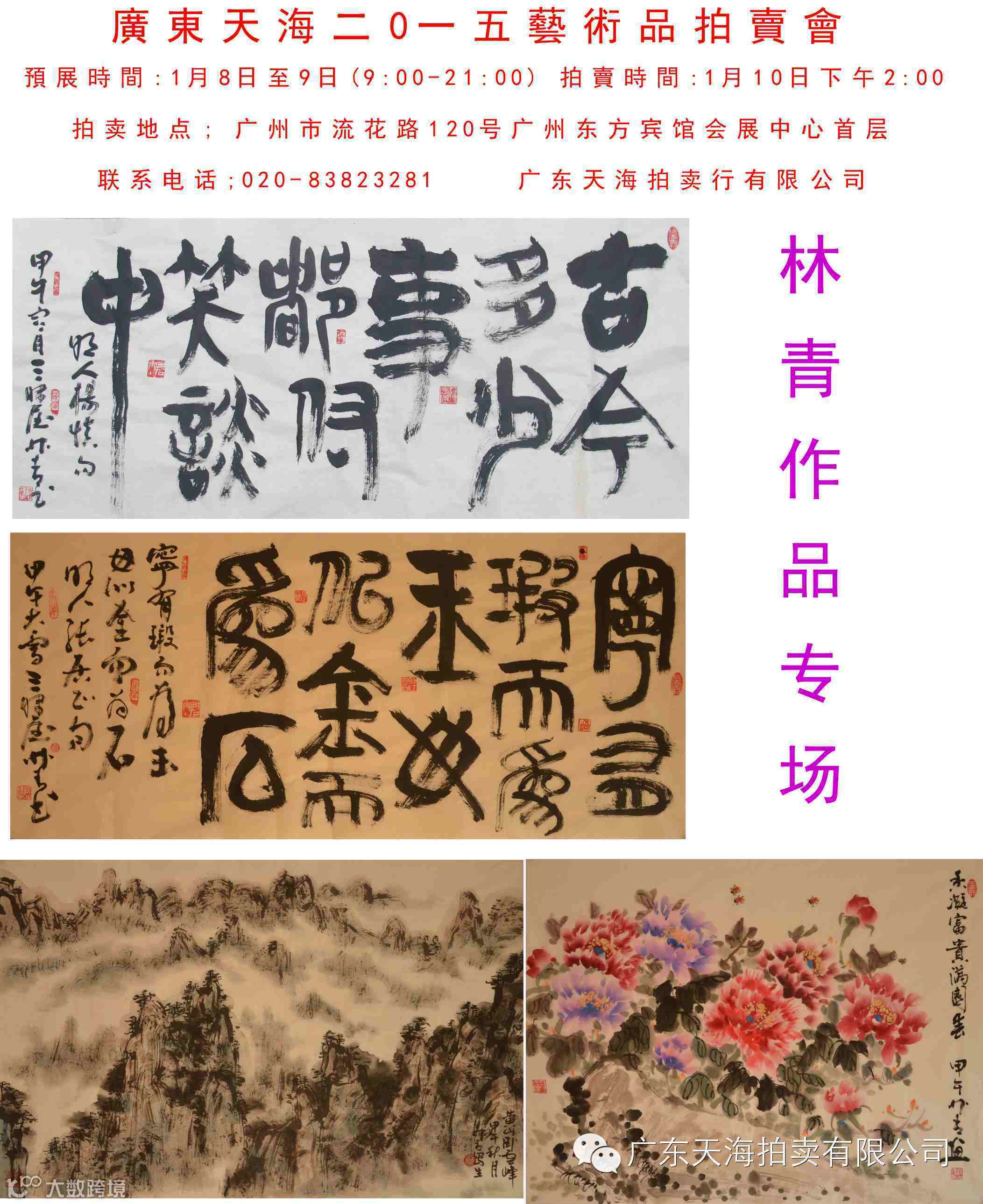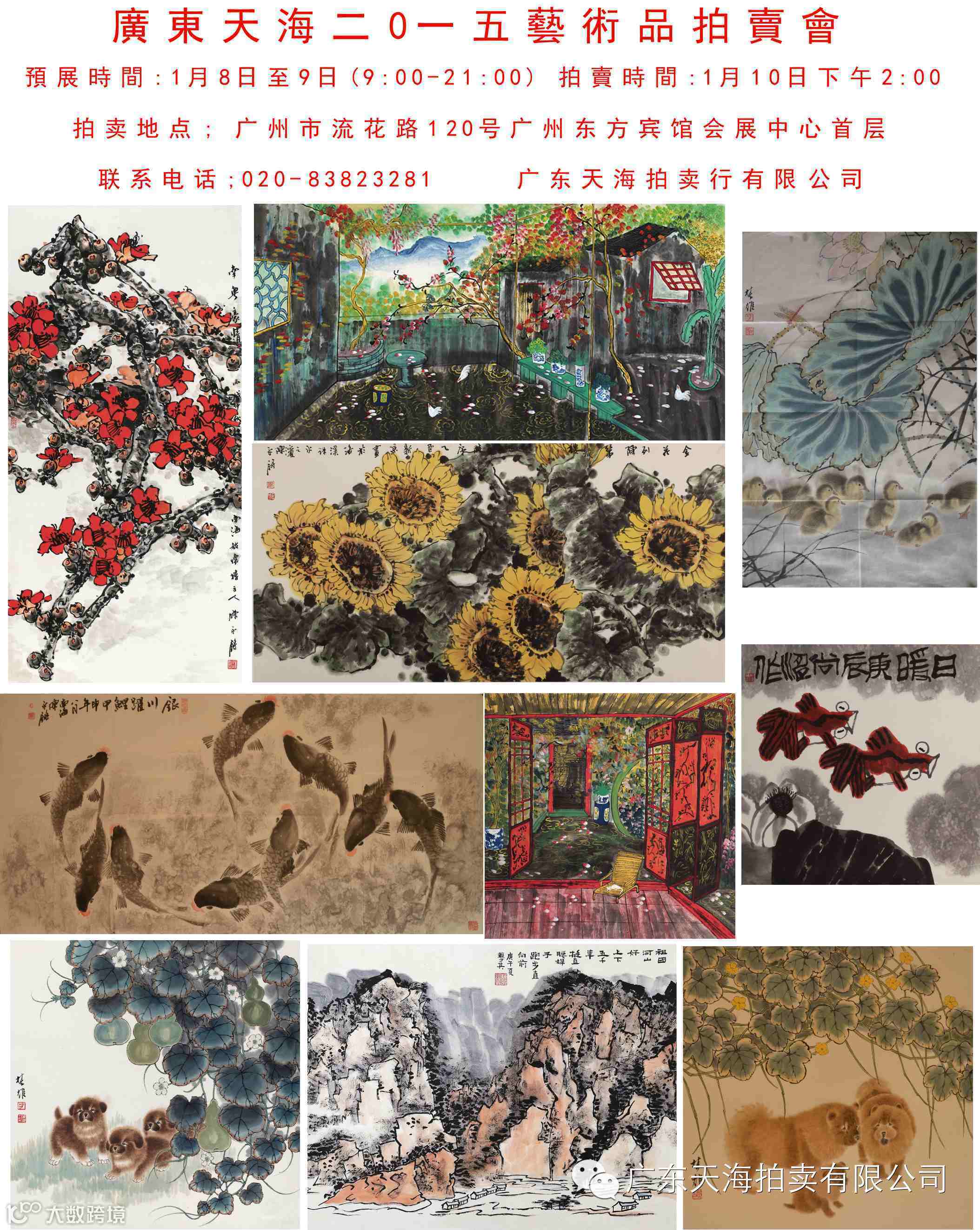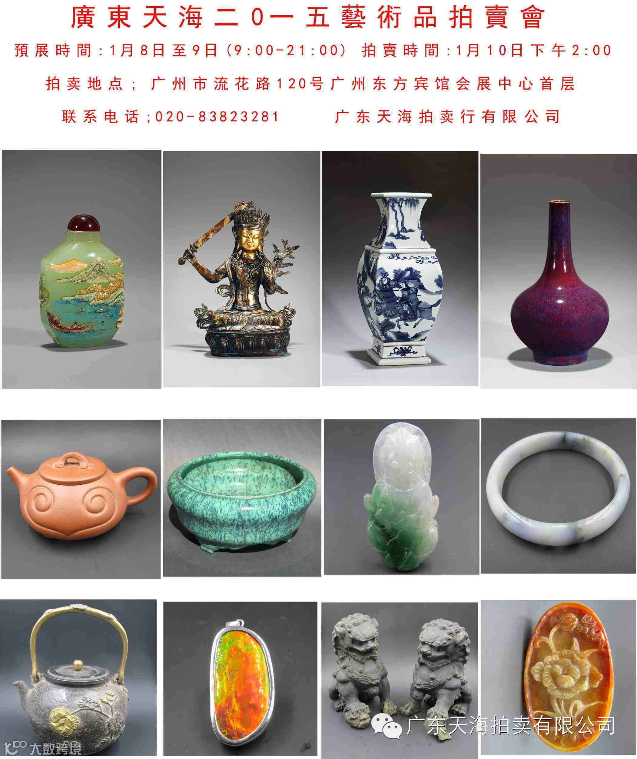 广东天海2015艺术品拍卖会 预展时间:2015年1月8日-1月9日 拍卖时间:2015年1月10日下午2:00 上午9:00-下午21:00(夜场预展) 拍卖地点:东方宾馆会展中心首层(广州市流花路120号) 联系电话:020-83823281