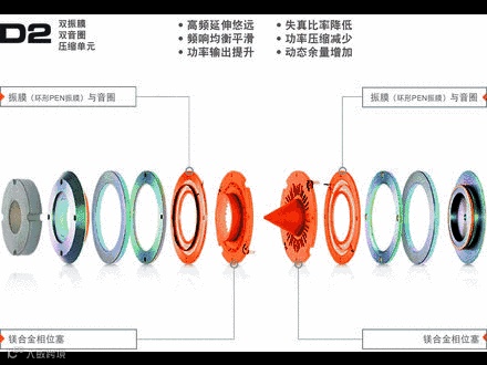 ►1.5英寸D2双音圈双振膜压缩高音单元令高频表现柔和通透、巨细尽显,且失真率极低;