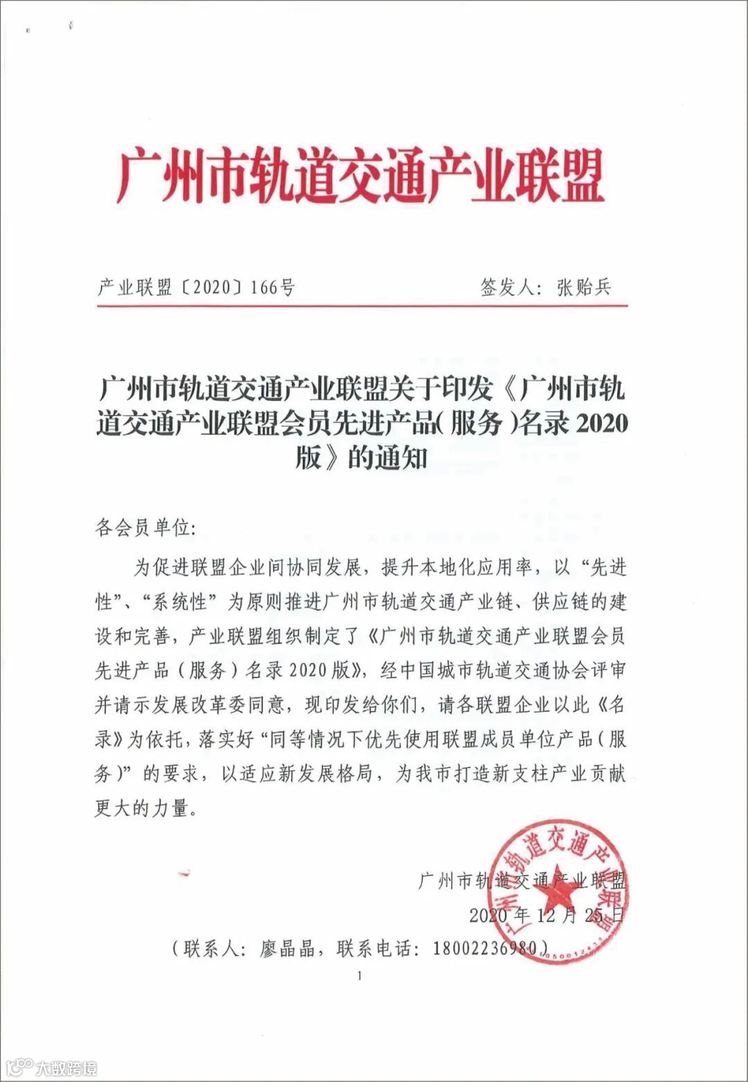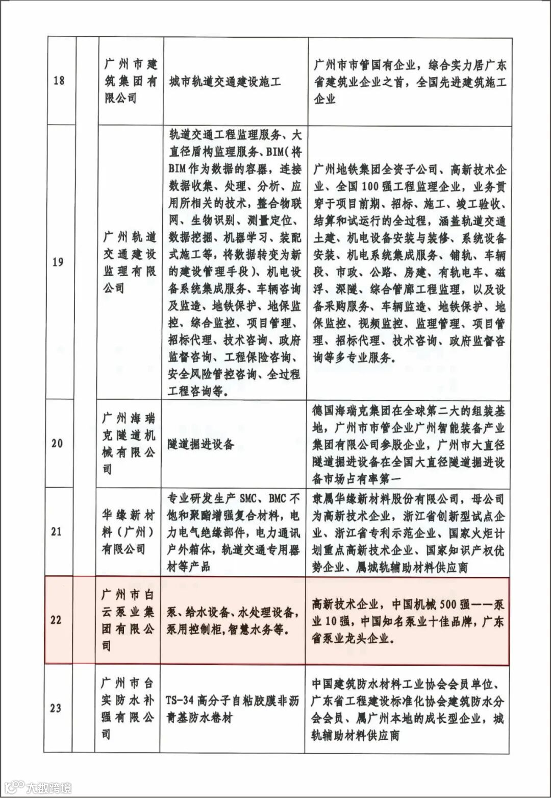 2020年12月25日,广州市轨道交通产业联盟印发《广州轨道交通产业联盟会员先进产品(服务)名录2020版》的通知,白云泵业作为广州轨道交通唯一泵类产业配套企业入选名录。