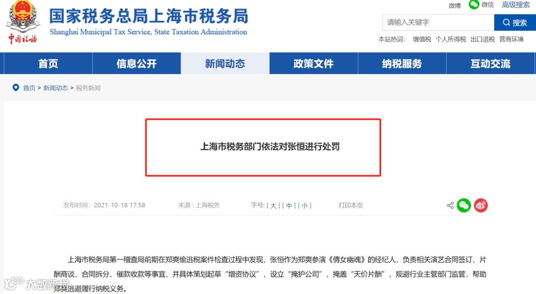 上海市税务部门依法对张恒进行处罚