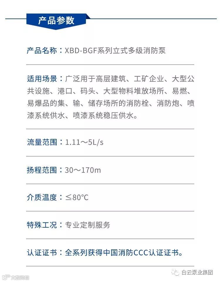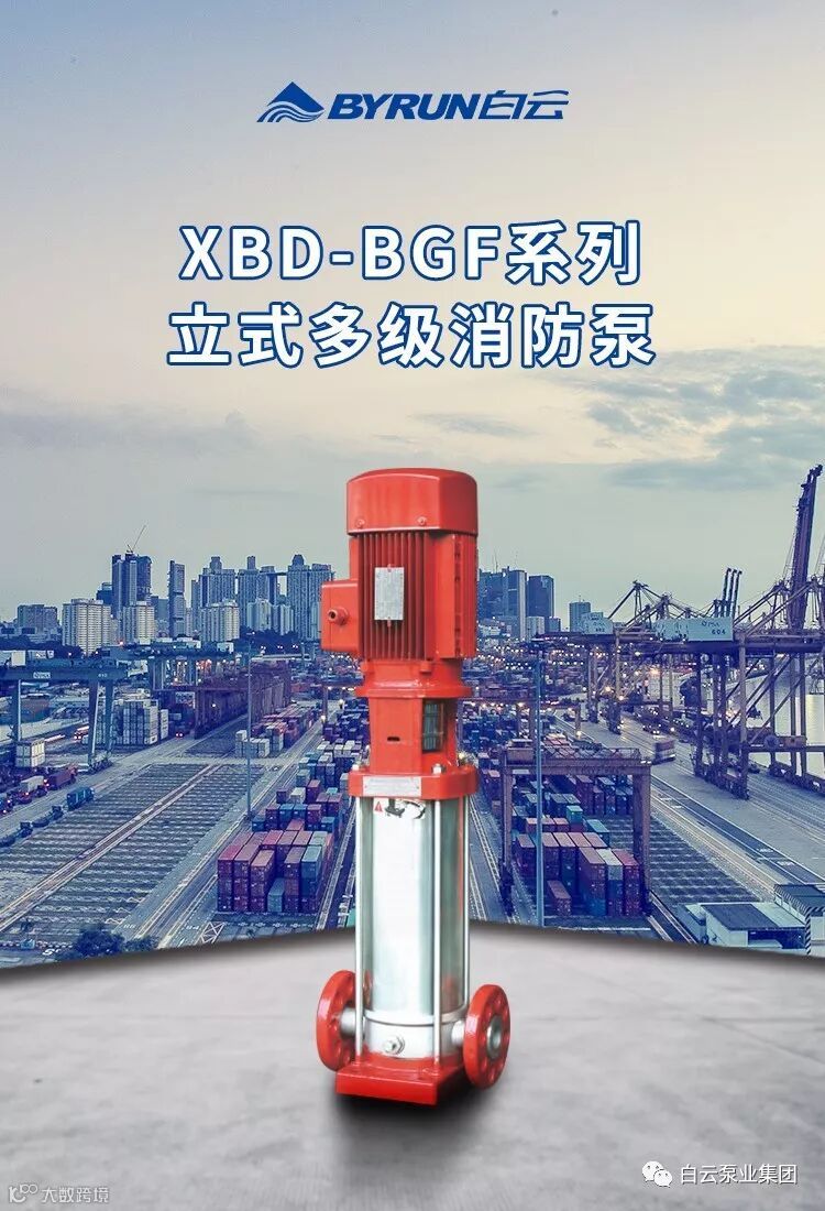 XBD-BGF系列立式多级消防泵是根据消防用泵的特点,全面贯彻执行GB6245《消防泵》标准要求,设计的新一代消防泵,该系列产品经公安部消防装备质量监督检测中心检测合格,取得全国消防产品CCC证书。