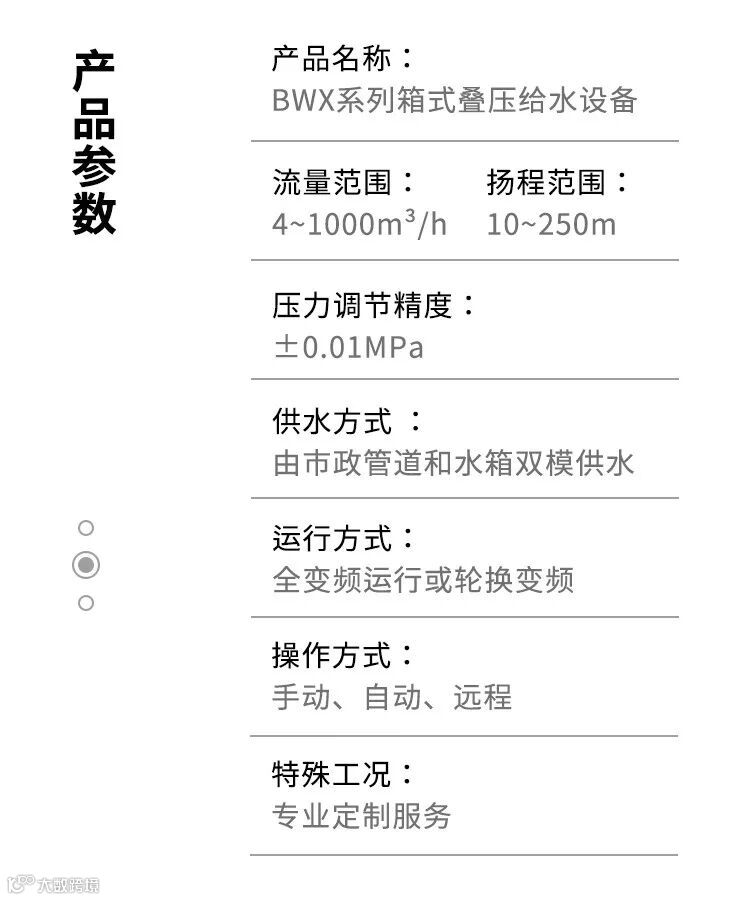 双模式供水:具有水箱供水模式和常规管网叠压变频供水模式,可根据自来水进水压力及流量自动切换,此种运行方式不但避免了市政管网负压的产生,并且保证了供水的连续性。