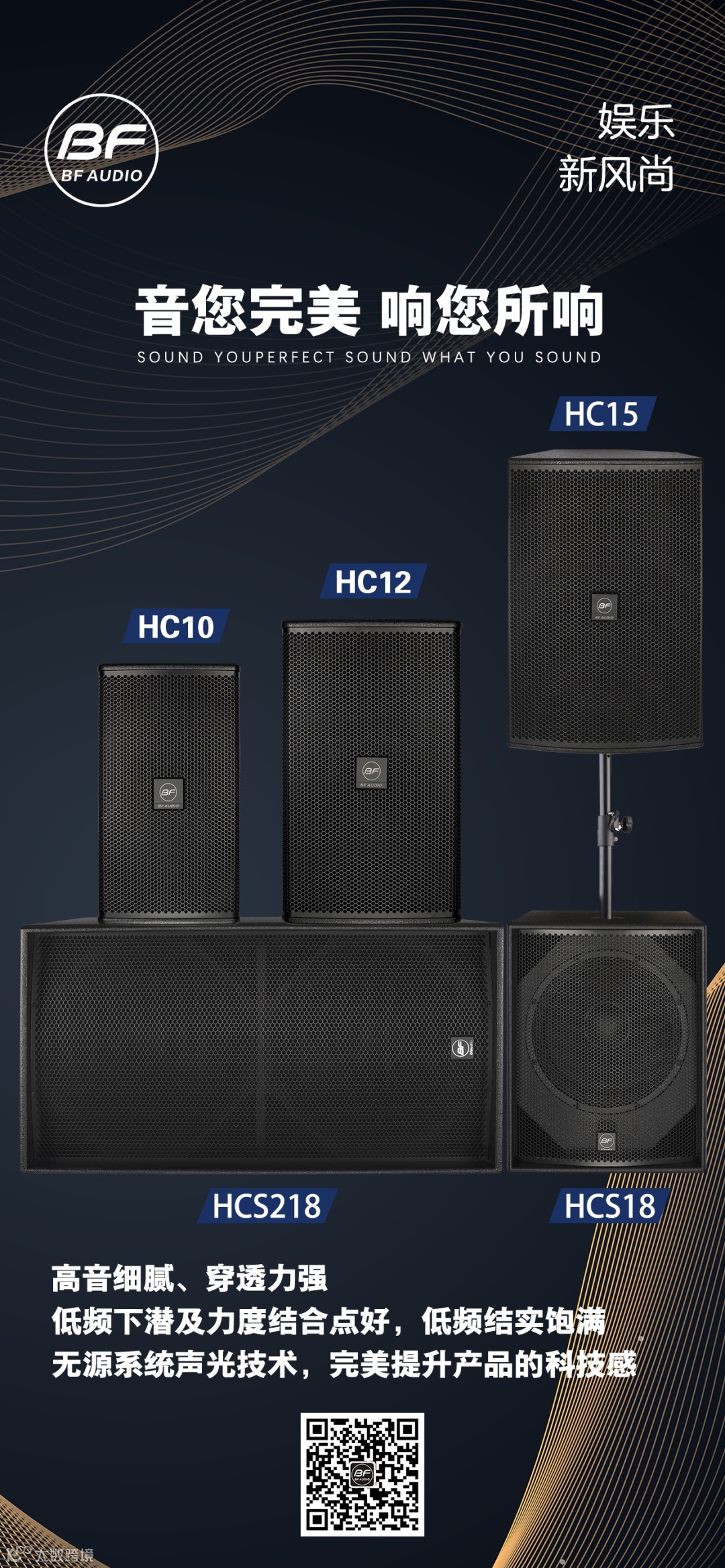 HC系列产品是专门为娱乐场合设计的一款高品质扬声器系统,该系列总共5个型号:HC10(10英寸音箱)、HC12(12英寸音箱)、HC15(15英寸音箱)、HCS18(1*18英寸低音炮)、HCS218(2*18英寸低音炮);其中HC10和HC12为后导向孔设计,HC15为前导向孔设计,HCS18和HCS218均为无源低音炮。