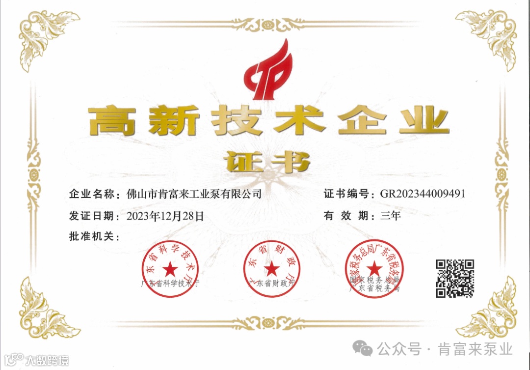近日,肯富来全资子公司佛山市肯富来工业泵有限公司取得新一期高新技术企业证书,有效期为三年(2023年-2026年)。
