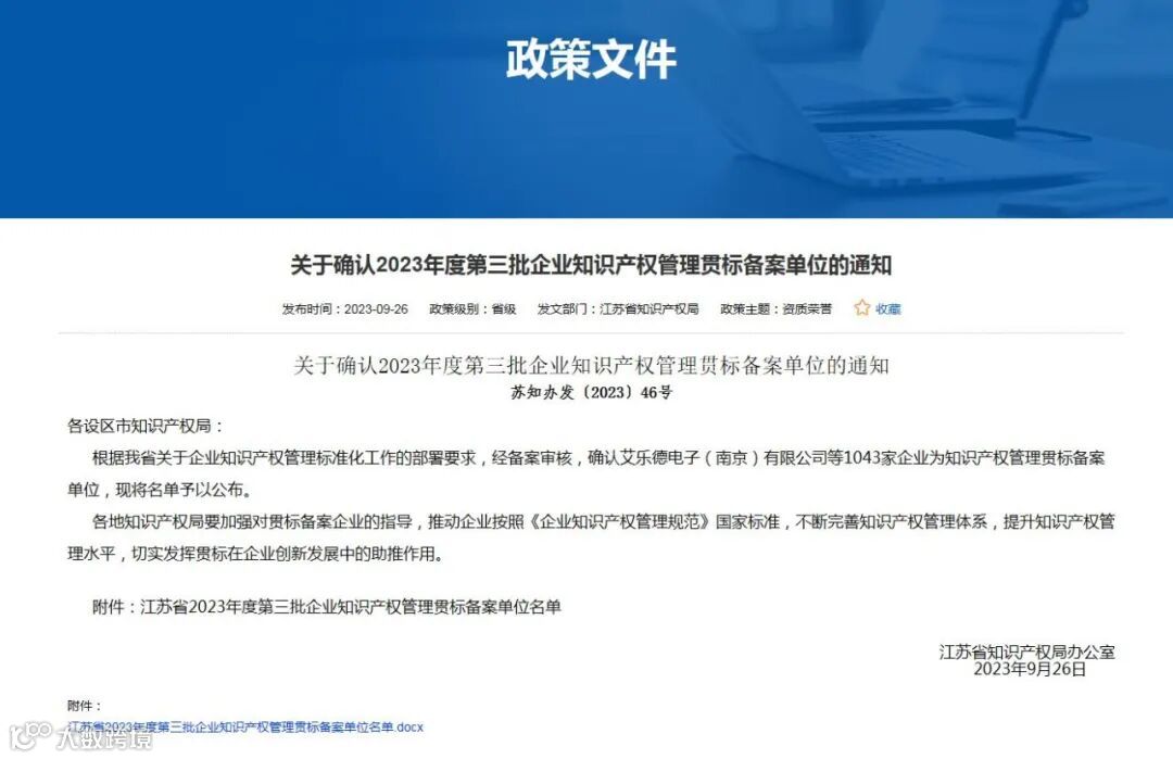 近期,江苏省知识产权局发布《关于确认2023年度第三批企业知识产权管理贯标备案单位的通知》,根据江苏省关于企业知识产权管理标准化工作的部署要求,经备案审核,长江时代通信股份有限公司正式获评江苏省2023年度第三批企业知识产权管理贯标备案单位。
