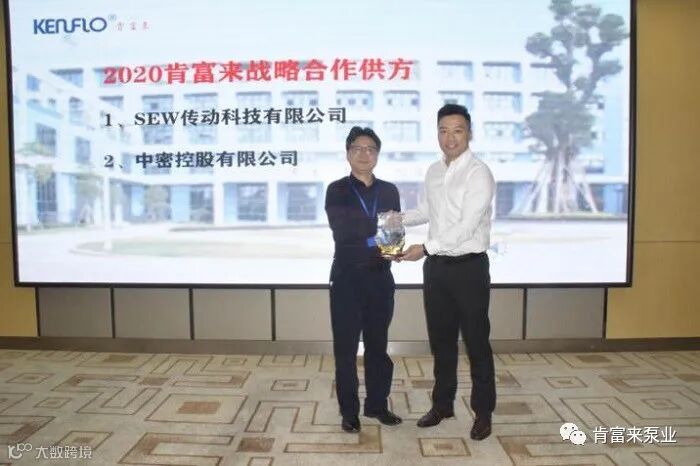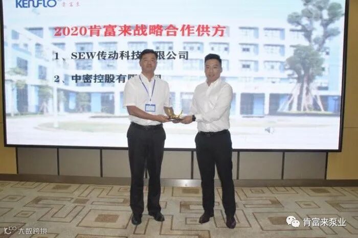 会议向肯富来战略合作伙伴——SEW-传动设备(广州)有限公司、中密控股股份有限公司授牌。中密控股股份有限公司副总经理奉明忠先生作为肯富来战略合作供方发表感言,寄语供需双方加强更加紧密的战略合作,实现双赢。