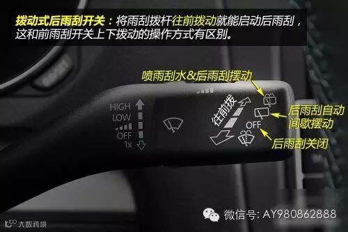 后雨刷的开关也设置在雨刷拨杆上,与前雨刷机构是两个独立的系统,可以单独控制。后雨刷开关有两种样式,分别为拨动式和旋钮式。