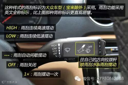 雨刷拨杆和车灯拨杆一样,上面印了很多功能标识。虽然不同品牌的标识及标识位置都有区别,但其实功能都是差不多的。
