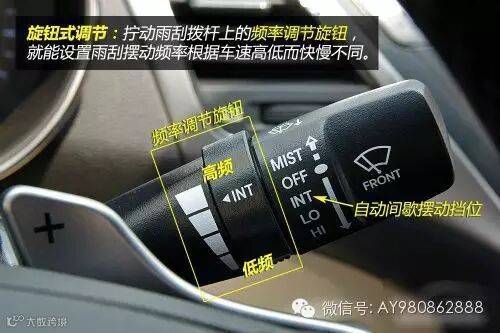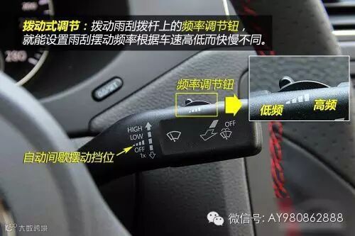 某些车型雨刷的自动间歇工作挡位是可以调节摆动频率的,让雨刷摆动频率根据车速高低而快慢不同——将雨刮拨杆置于“自动间歇摆动”挡位时,雨刷便会依照调节的频率,根据车速快慢来变化摆动频率。摆动频率的调节机构主要有两种样式:拨动式及旋钮式。