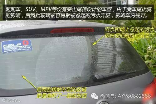两厢车、SUV、MPV等没有突出尾箱设计的车型都会配备后雨刷,这是由于这些车型受车尾扰流的影响,后风挡容易被卷起的污水或泥沙弄脏。