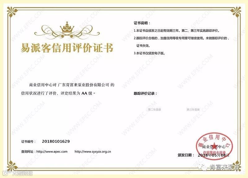 广东肯富来泵业股份有限公司凭借自身雄厚实力及客户历年好评,经过中石化易派客企业信用认证体系相关专家严格审核,荣获中石化易派客企业法人信用认证AA等级。