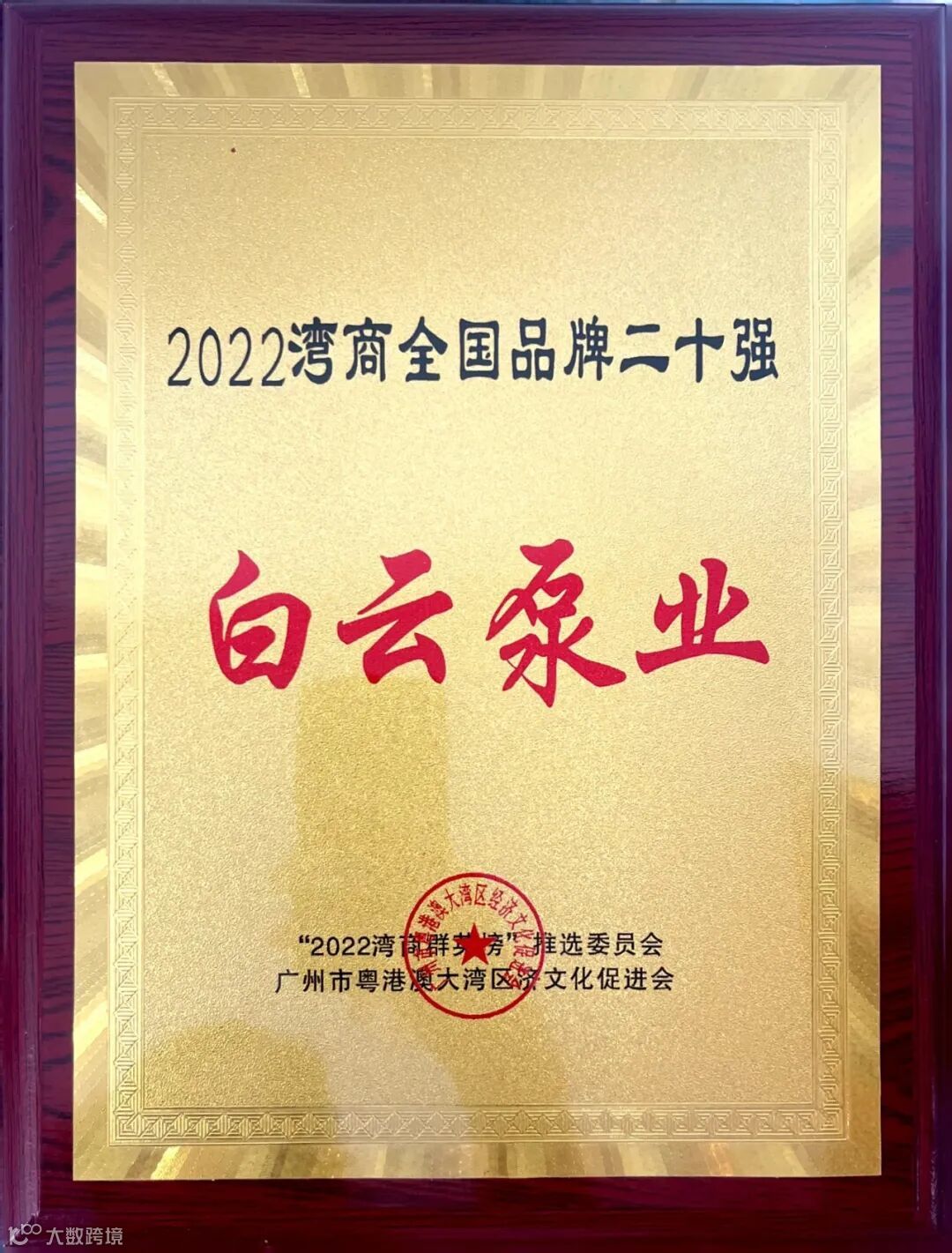 其中,白云泵业集团荣获“2022湾商臻品百强”称号。