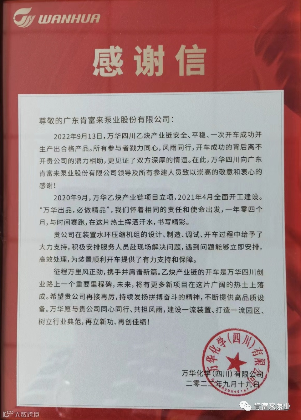 肯富来作为万华化学的战略合作伙伴,在疫情持续影响的情况下,克服万难,为万华四川乙炔项目提供技术先进、质量可靠的乙炔压缩机、循环水泵等设备,以及全天候的现场服务,积极配合完成现场的调试、并网开机工作。9月13日万华四川天然气制乙炔产业链项目的成功开机也预示着肯富来向打造“百年品牌”的目标再次迈出坚实的一步。