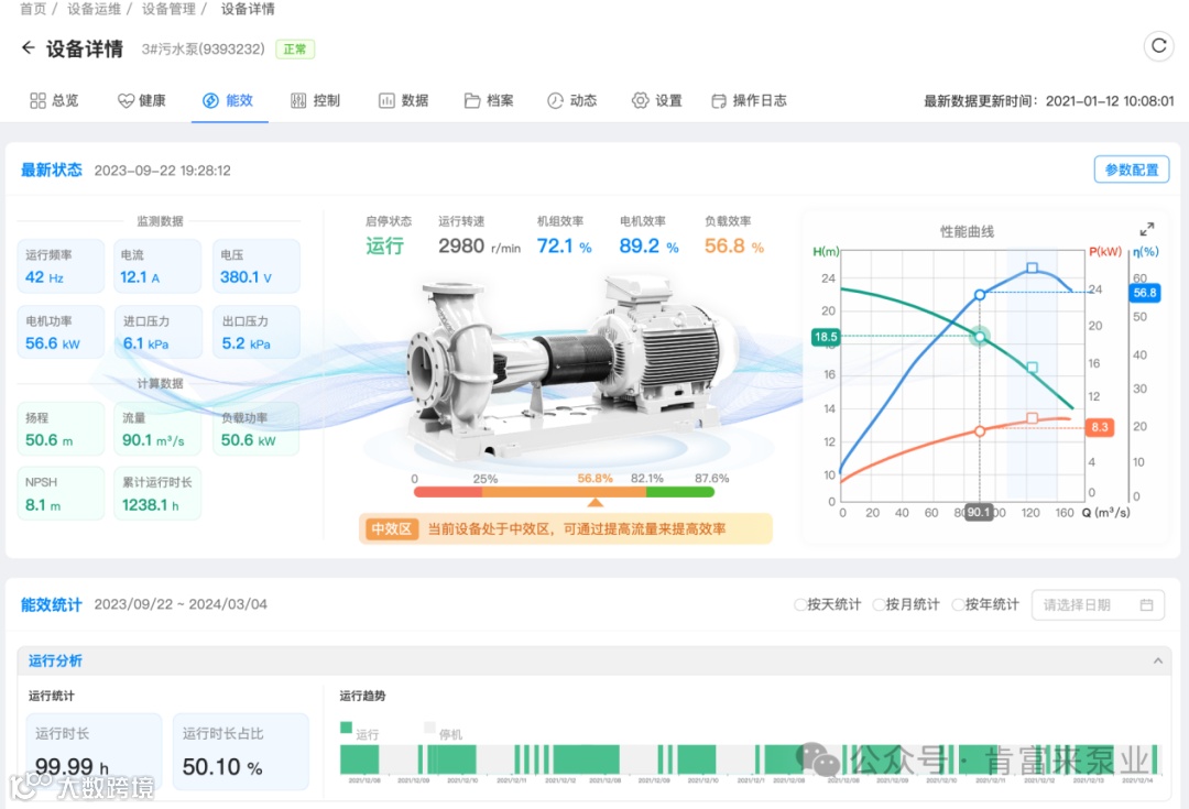 通过监测设备的压力、流量、温度等数据,肯富来KICS智能云服务平台可以实现水泵、风机、电机等设备的能效监测与分析,在保障满足工艺运转的情况下,及时调整各类参数,保障现场设备处于最佳能效运行。