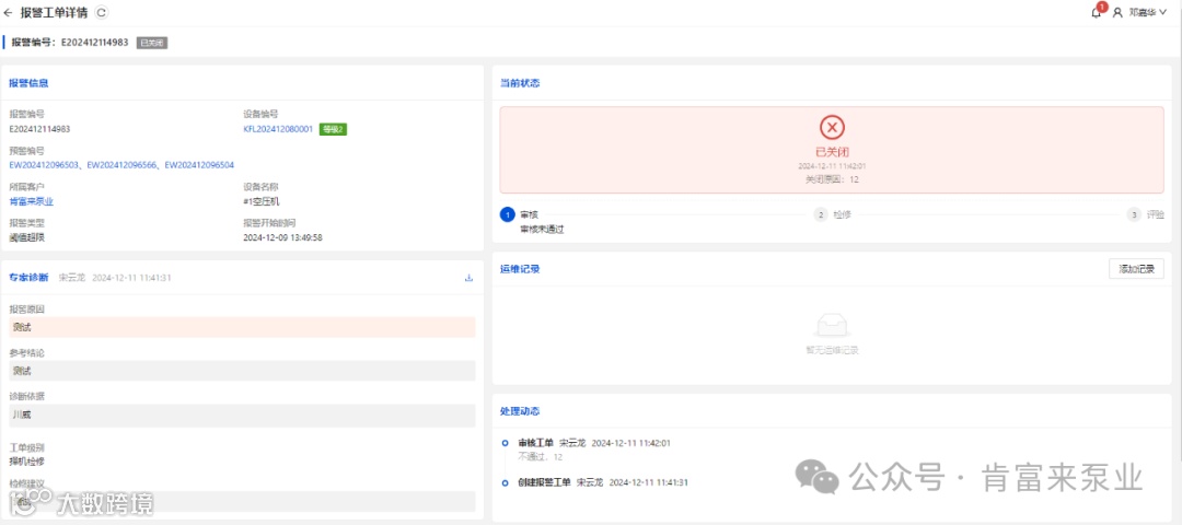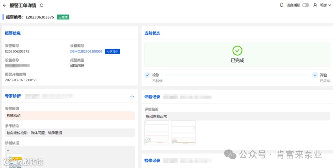 传统工业设备售后维保往往采用被动式响应,肯富来K-ISS智能服务云平台将用户售后服务升级为主动运维,后台看护设备存在异常时,主动联系用户,推送报警工单、出具故障诊断报告,对看护设备进行超前维保维护,保障设备处在最佳状态运行,延长设备使用寿命、减少备件时间、备件库存,提升售后服务满意度。
