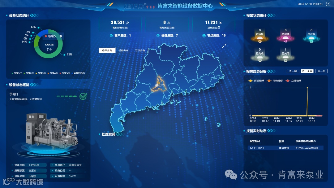 肯富来智能云服务是机泵应用转型升级的核心。在互联网、大数据、人工智能等技术的推动下,制造业的各个环节都在逐步实现数字化。肯富来智能云服务提供设备健康状态看护、设备能效分析、智能运维管理等多个功能模块组成,为用户提供全方位设备智能化升级服务。