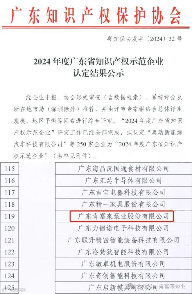 近日,广东肯富来泵业股份有限公司被正式评定为2024年度广东省知识产权示范企业。这一荣誉的获得不仅是对肯富来在知识产权创建、运用、保护和管理方面成就的认可,也是对其长期以来坚持自主创新和科技研发的肯定。